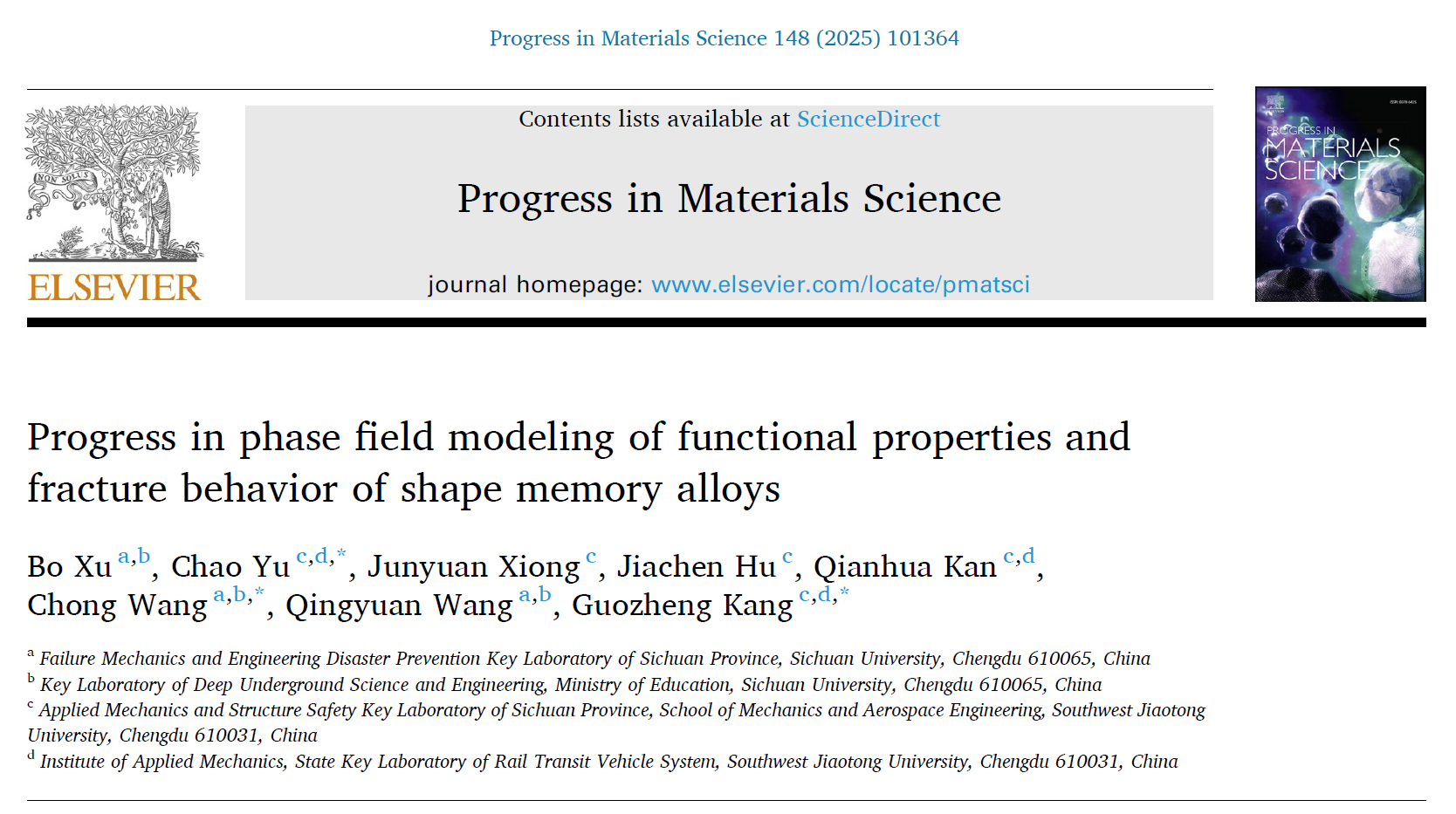 近日,西南交大康国政教授团队在顶级综述期刊Progress in Materials Science(IF = 33.6)上发表了题为“Progress in phase field modeling of functional properties and fracture behavior of shape memory alloys”的综述论文。已毕业博士生徐波(现就职于四川大学)为论文第一作者,西南交大康国政教授、于超教授和四川大学王宠教授为论文共同通讯作者,西南交大阚前华教授、四川大学王清远教授和西南交大必赢565net官网博士生熊君媛、胡佳晨为合作作者。