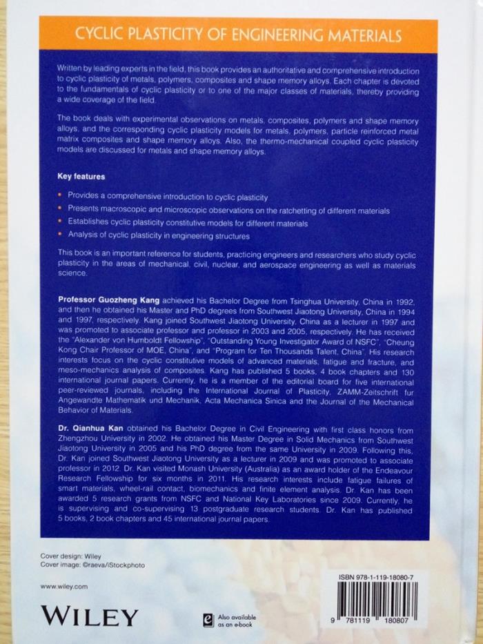 John Wiley & Sons Ltd于1807年在纽约创办,是全球历史最悠久﹑最知名的学术出版商之一,享有世界第一大独立的学协会出版商和第三大学术期刊出版商的地位。此次出版的专著汇聚了“结构服役安全及力学基础”四川省青年科技创新团队近二十年的研究成果,系统介绍了循环塑性实验、理论、应用和未来发展趋势,研究范围涉及37种材料,包括金属、高性能聚合物、颗粒增强金属基复合材料、生物组织材料和形状记忆合金合金等几大类。共发表SCI论文159篇,引用1200余次。包括力学主流期刊International Journal of Plasticity (14篇), Journal of Mechanics and Physics of Solids(2篇),Mechanics of Materials (13篇),Material Science and Engineering A(12篇), Computational Materials Science (8篇),International Journal of Fatigue(8篇)等。