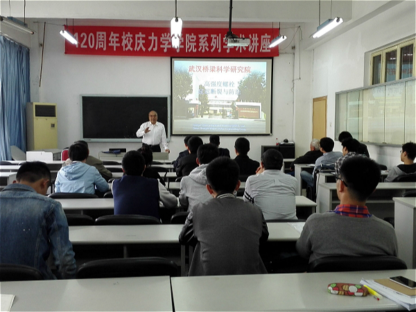 讲座开始穆教授表达了对母校的思念之情,讲述了在母校100周年庆时来做讲座的情景。紧接着穆教授正式开始此次讲座,讲座主要包括以下几个方面,第一讲了高强度螺栓的病害,第二向大家讲解了高强度螺栓的抗断实验研究以及应力腐蚀试验,第三为大家介绍了形位公差对螺栓受力的影响,第四介绍了高强度螺栓的安全度和断裂率。最后为大家总结:高强度螺栓延迟断裂的外因为形位公差过大,内因是热处理工艺不当,降低回火温度是力学性能降低,最终导致不能满足断裂判据而发生延迟断裂。演讲结束同学们积极发言,现场气氛热烈。