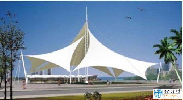 膜结构(Membrane)是20世纪中期发展起来的一种新型建筑结构形式,是由多种高强薄膜材料(PVC或Teflon)及加强构件(钢架、钢柱或钢索)通过一定方式使其内部产生一定的预张应力以形成某种空间形状,作为覆盖结构,并能承受一定的外荷载作用的一种空间结构形式(如图所示)。膜结构具有自清洁性、透光性、大跨度、轻量结构、舒适空间、不易积雪、防火性和耐久性、造型优美等优点,广泛应用于体育场、景观及建筑顶棚等。2008年北京奥运会主场馆“鸟巢”和“水立方”结构均含有优秀的膜结构元素。