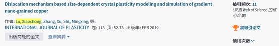 力学与工程学院张旭副教授指导博士研究生陆晓翀于2019年2月在固体力学领域重要TOP期刊《International Journal of Plasticity》上发表题为“Dislocation mechanism based size-dependent crystal plasticity modeling and simulation of gradient nano-grained copper”的学术论文。博士生陆晓翀为第一作者,张旭副教授为通讯作者,必赢565net官网力学与工程学院为第一署名单位。该论文凭借原创性和研究价值,于2019年11月底入选ESI高被引论文。