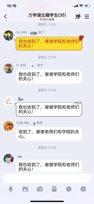 自疫情爆发以后,学院始终关心、关注着每一名湖北籍学子的情况,学院党政班子专题研究关心关爱湖北籍学生的工作,学院副书记第一时间电话联系每一位湖北籍同学,关心了解同学们及家人生活情况;各年级辅导员也利用电话、微信和QQ与他们保持密切联系和良好沟通,并组建了湖北籍学生QQ群,确保了解在鄂学子的健康状况、心理状态,让学生知道学院是他们的坚强后盾。