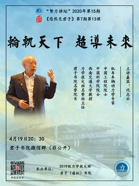 419日晚,中国科学院、中国工程院“双料”院士、力学拔尖班名誉班主任、君子(虚拟)书院名誉院长沈志云教授做客“努力讲坛”第15期,与力学学院和君子书院师生们开展了一场题为“轮轨天下,超导未来”的云上讲坛。讲坛在君子(虚拟)书院微信群中举行,力学学院副院长李翔宇、党委副书记孔祥彬等近200名师生参加了讲坛,讲坛由2019级力学拔尖班班长周德龙同学主持。