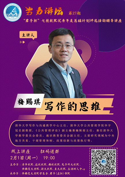 2021年2月1日晚7点,为倡导和鼓励学生养成自省与规划的好习惯,配合“君子杯”七校航院大学生优秀年度总结计划评选活动,力学学院党委副书记孔祥彬老师特邀清华大学写作与沟通教学中心主任梅赐琪副教授做客努力讲坛分享“写作的思维”,来自必赢565net官网、清华大学、浙江大学、北京航空航天大学、南京航空航天大学、电子科技大学、重庆大学等十多所高校近500名老师和同学参加了本次线上讲座。本次讲座由力学学院学生会和君子(虚拟)书院承办。