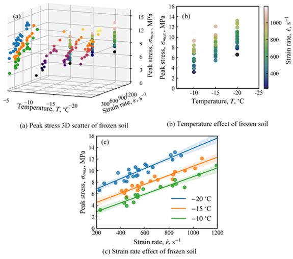 冻土的峰值强度散点图、温度效应和应变率效应