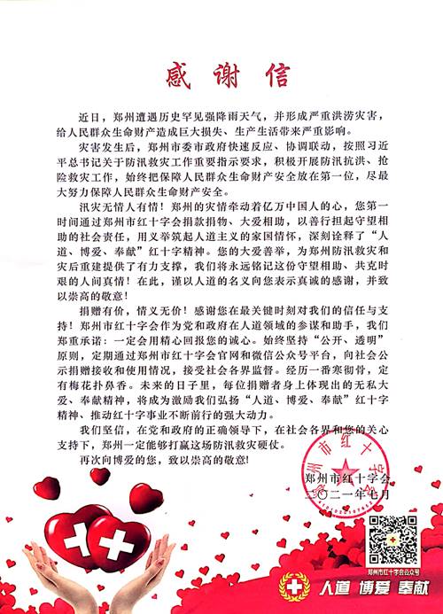 在班级捐款后收到了来自郑州红十字会的感谢信!