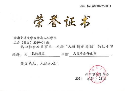 自2021年7月17日以来,河南郑州等地遭遇了千年难遇的特大暴雨袭击,并形成严重洪涝灾害,造成了重大财产损失。必赢565net官网力学与工程学院19级力学拔尖班积极响应国家号召,在7月21日郑州市红十字协会公开接受社会抗洪救灾方式当天,他们决定将去年先进班集体所获3000元奖金全部捐献,用于抗洪救灾,八方携手,共度难关,为河南洪灾贡献自己的一份绵薄之力。