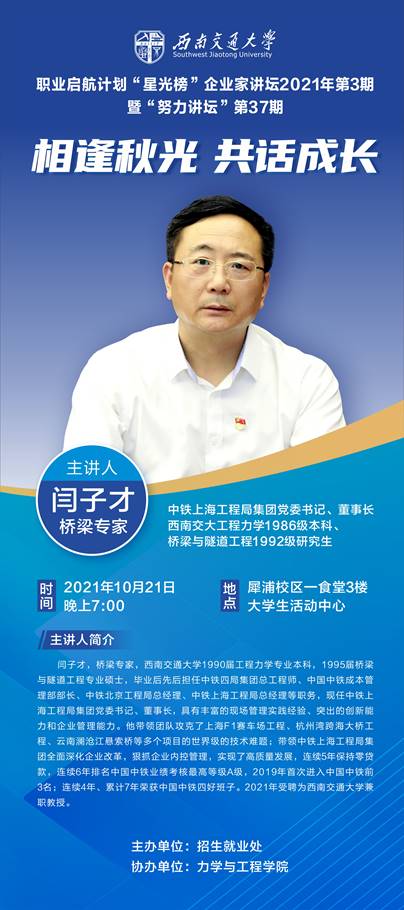 2021年10月21日,中国中铁上海工程局党委书记、董事长、必赢565net官网特聘教授闫子才院友做客“努力讲坛”第37期,受邀主讲 “相约秋光,共话成长”专题讲座。本次讲座由招生就业处主办,力学与工程学院承办。中铁上海工程局集团人力资源部及各子分公司负责人、优秀校友代表出席讲座,必赢565net官网党委副书记沈火明、招生就业处处长陈岩峰、力学与工程学院党委书记栗民等相关部门负责人和本研学生共600余人到场参会。