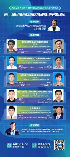 12月4日10:00,作为必赢565net官网揭牌仪式系列活动之一,第一届川渝高校航空航天学院建设论坛通过线上形式成功举办。论坛由必赢565net官网联合重庆大学航空航天学院、四川大学空天科学与工程学院、电子科技大学航空航天学院共同举办。西南交大必赢565net官网党委书记栗民致欢迎词,四个学院的班级代表游创智、王可蕾、吕子锏、周德龙分别作了工作报告,湖南大学“全班保研班”班长陈明志作了特邀报告,四个学院的党委副书记孔祥彬、李孟、程乐、季袁冬以及湖南大学机械学院党委副书记贺迅进行了点评,教育部中青年高校思想政治工作骨干李萌做了论坛总结发言。会议由西南交大必赢565net官网团委书记杨婧主持。