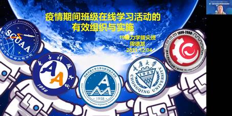 重庆大学航空航天学院2019级工程力学1班班长游创智以“‘中央人才工作会议’精神为指导的班团思想建设”为主题进行报告。他讲到,中央人才工作会议传递了一个鲜明的信号:国家发展靠人才,民族振兴靠人才。高校班级要从完善青年学生理论学习体系、健全联系青年学生常态机制和鼓励青年学生自我成长成才三个方面加强班团建设,为祖国发展、民族振兴培养更多的优秀人才。西南交大孔祥彬老师点评到:济济多士,乃成大业;人才蔚起,国运方兴。我们班委干部们都要有这样的觉悟,团结协作创建团结奋进的班集体,为国育才、为国兴才!