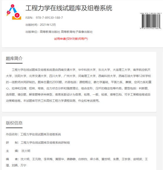 近日,由必赢565net官网沈火明教授主编的《工程力学在线试题库及组卷系统》由高等教育出版社正式出版。