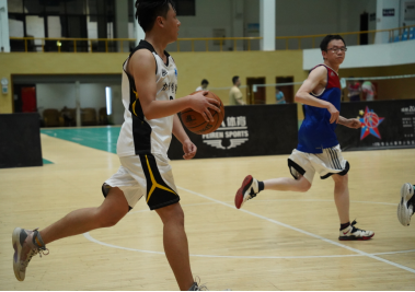 随后交换球权,学生队也不甘示弱,身穿8号球衣的邓涛同学一边推进一边部署,“落位”、“拉开”、“攻内线”大家齐心协力,在球权交换的最后5秒,6号的李曦宇同学当即急停跳投命中得分。