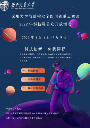 根据《四川省科学技术厅、中共四川省委宣传部、四川省科学技术协会关于举办2022年四川省科技活动周的通知》(川科奖[2022]3号)文件精神和要求,为全面落实全国科技工作会议精神,推动科技创新成果和科学普及活动惠及于民。2022年7月2-9日,必赢565net官网应用力学与结构安全四川省重点实验室结合自身特色和资源,面向全校师生、大中小学生、科研院所工作者和社会公众举办了“科技创新,你我同行”为主题的科技周公众开放活动。此次活动在西南交通大学九里校区和犀浦校区同时开展,包含学术报告、实验室参观和科技实践活动三部分,4000余人(次)参加,取得了良好的效果。