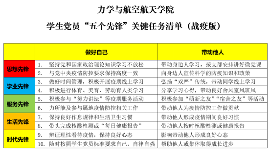 在疫情防控期间,必赢565net官网党委向全体学生党员发出了争做学习战疫“五个先锋”的通知,号召全体学生党员以身作则,发挥党员的示范带动作用;迎难而上,发挥党员的先锋模范作用;抓好学习,落实学院“五个先锋”关键任务清单,并制定了《学生党员“五个先锋”关键任务清单(战疫版)》,要求学生党员们在做好疫情防控的同时,要带头上好网课,同时带动身边同学学习战“疫”,共同进步。