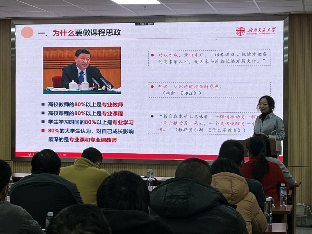 随后,谢瑜从“功以才成,业由才广,培养造就大批德才兼备的高素质人才,是国家和民族长远发展大计”为切入点,剖析了建设课程思政的必要性与重要性。她从认识、实践、方法和教师间的交流通道四个方面对当前课程思政实施过程中存在的诸多困境进行了分析,然后从深化思想认识、组织系统培训、构建同行学习机制和健全课程思政考核评估体系等方面给出了优化策略。