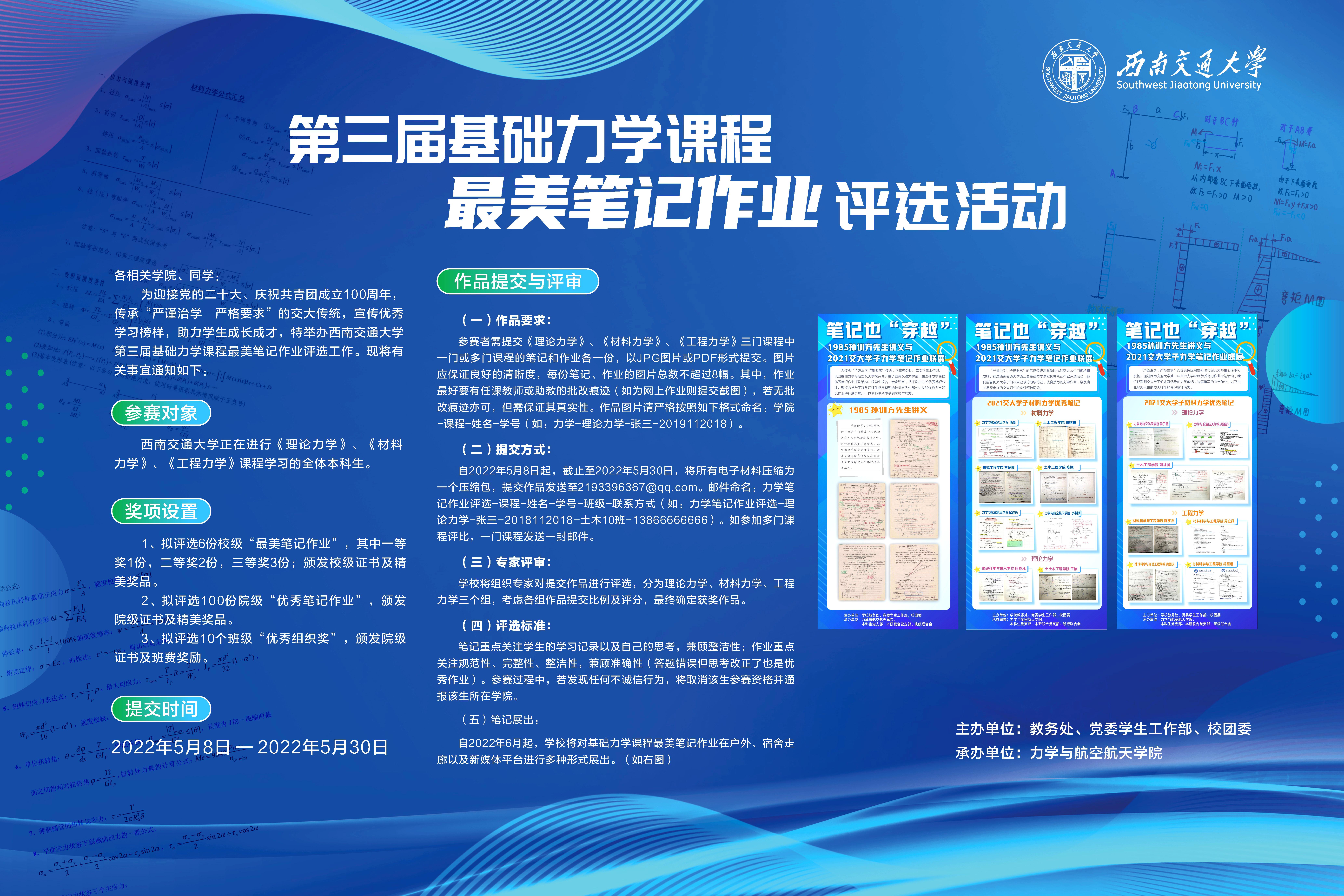 为迎接党的二十大、庆祝共青团成立100周年,传承“严谨治学严格要求”的交大传统,宣传优秀学习榜样,助力学生成长成才,特举办必赢565net官网第三届基础力学课程最美笔记作业评选工作。现将有关事宜通知如下:
