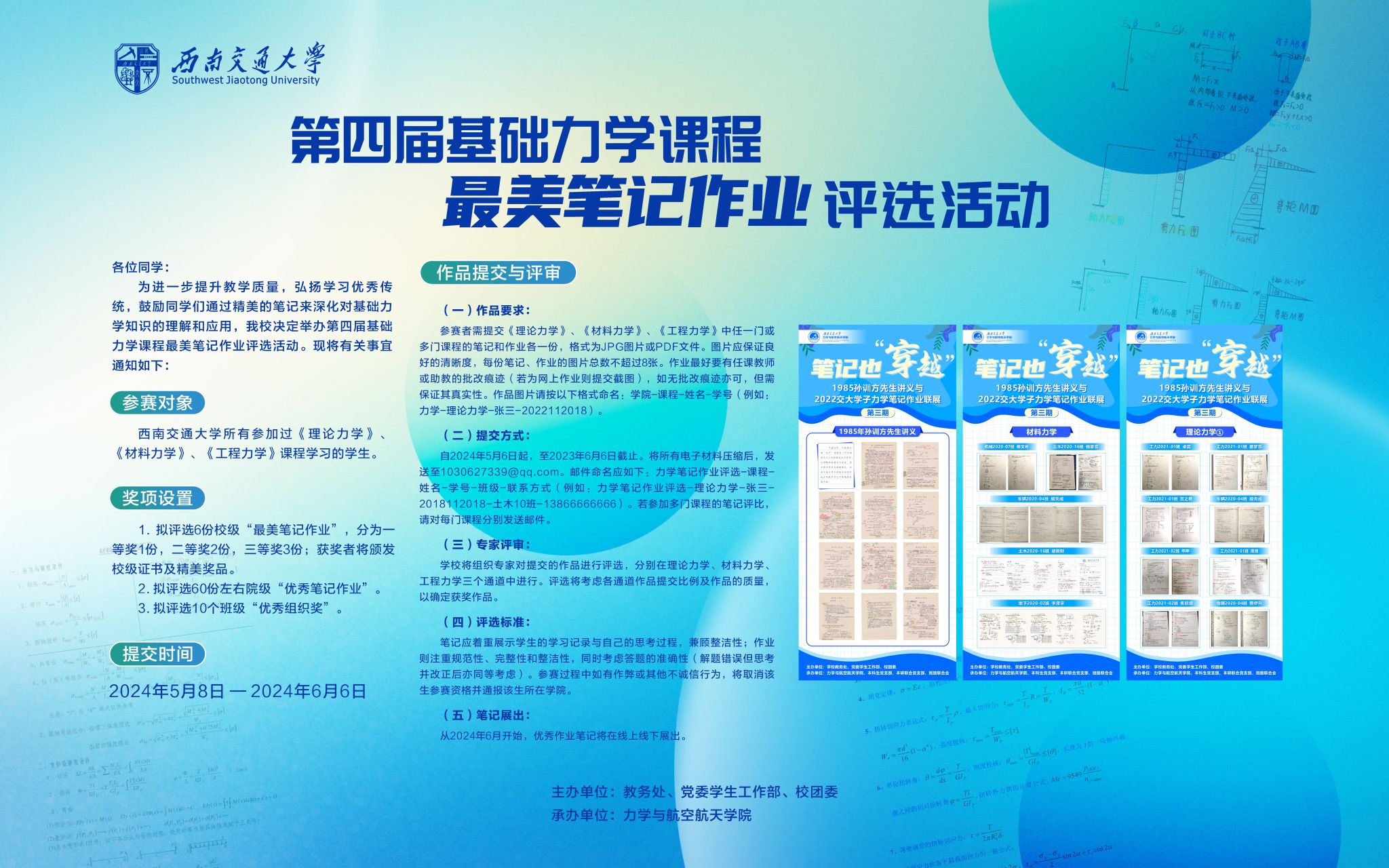 为进一步提升教学质量,弘扬学习优秀传统,鼓励同学们通过精美的笔记来深化对基础力学知识的理解和应用,我校决定举办第四届基础力学课程最美笔记作业评选活动。现将有关事宜通知如下:
