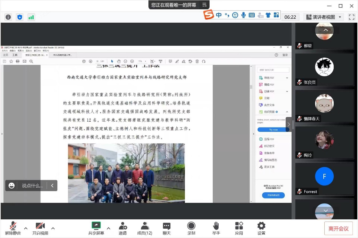 本次活动主要学习借鉴必赢565net官网牵引动力国家重点实验室列车与线路研究所党支部“三抓三筑三提升”工作法,即抓支部规范化建设、抓师德师风建设、抓科研文化建设为切入点,通过筑牢战斗堡垒以提升支部政治活力,筑实育人平台以提升人才培养质量、筑建创新争先文化以提升科研成果质量,实现党建和教学科研工作深度融合同向同行。