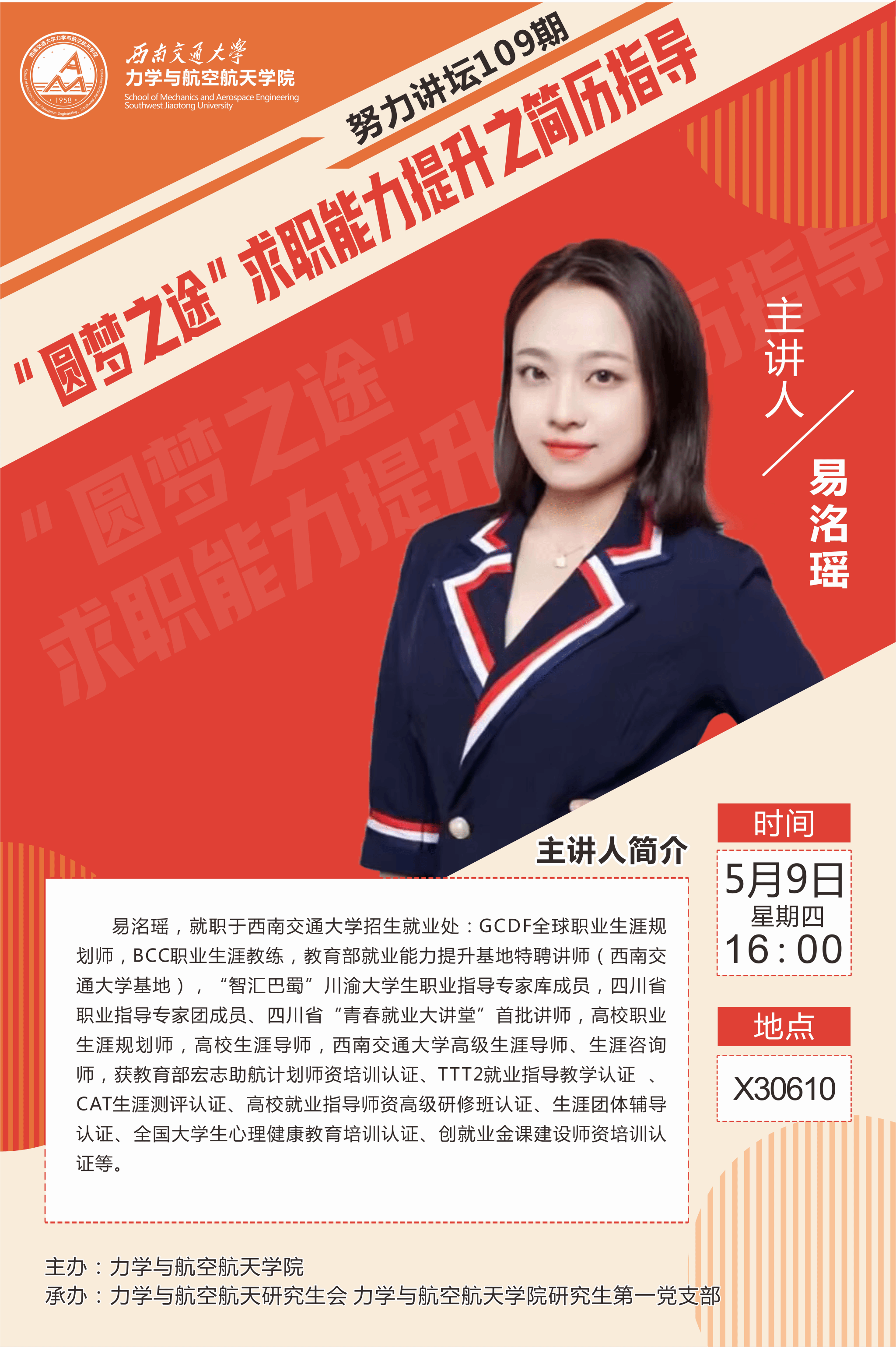 5月9日16:00,必赢565net官网“力久弥新,航宇未来”生涯咨询室在犀浦校区X30610教室成功举办了“努力讲坛”第109期活动,主题为“圆梦职途”求职能力提升之简历指导。此次活动特邀了我校招生就业处的GCDF全球职业生涯规划师、教育部就业能力提升基地特聘讲师易洺瑶,为2025届应届毕业生在职业目标选择和简历撰写方面提供了专业指导。