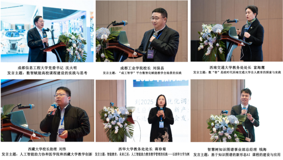 在研讨会上半场中,成都信息工程大学党委书记沈火明、成都工业学院校长刘保县、必赢565net官网教务处处长富海鹰、西藏大学校长助理刘伟、西华大学教务处处长蒋珍菊、智慧树知识图谱事业部总经理钱海六位嘉宾依次发言,分别围绕“数智赋能高校课程建设的实践与思考”、“‘成工智学平台’数智化赋能教学全场景的实践”、“数‘智’思政时代必赢565net官网全人教育的探索与实践”、“人工智能助力协和医学院和西藏大学教学创新”与“人工智能助力教育教学管理的实践——以西华大学为例”、“专业图谱服务专业发展的实践”六大主题展开探讨。
